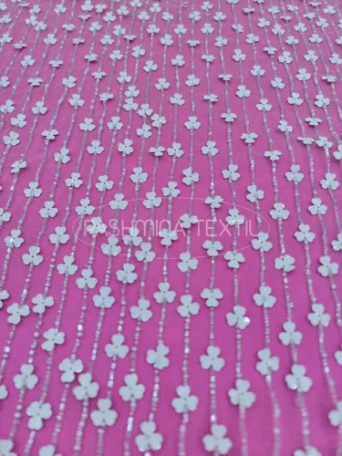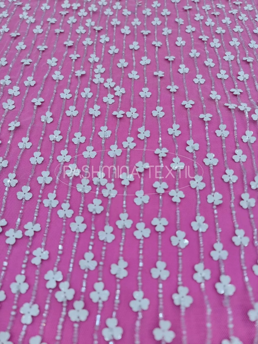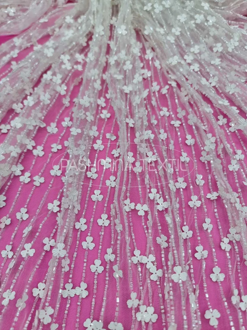 Hosszú vonalvezetésű ruhák elkészítéséhez ajánljuk. A csipke 110 cm széles, ezt az anyaghányad kiszámításánál vegyétek figyelembe! A képen látható csipke klasszikus bordűrrésszel nem rendelkezik. Tüll alapra készült, hosszanti gyöngyökből álló csíkokkal és flitter virágokkal alakították ki a design-t. Hosszában csíkozott a minta, de szálirány nélküli azaz forgatható tetszés szerint.