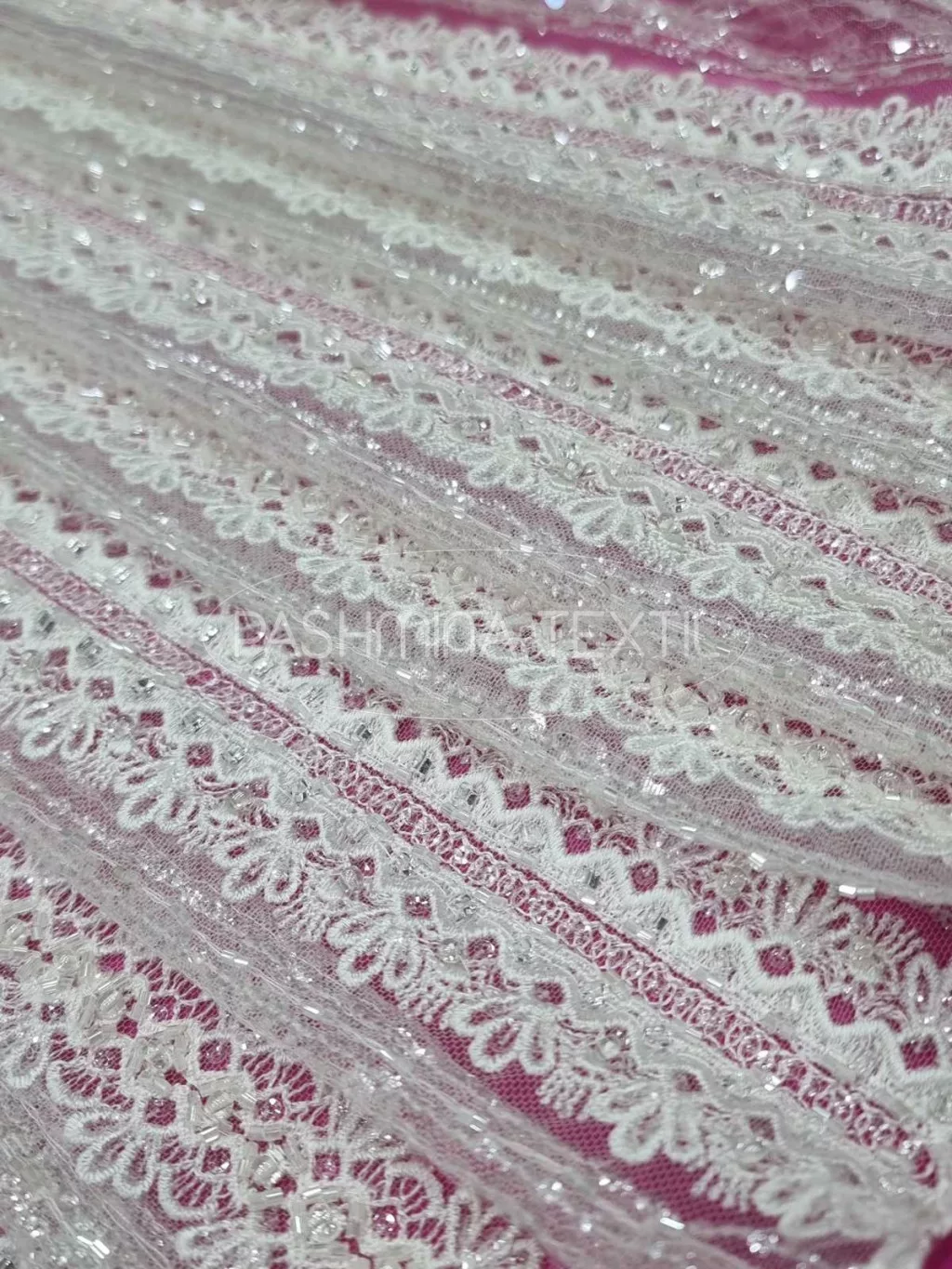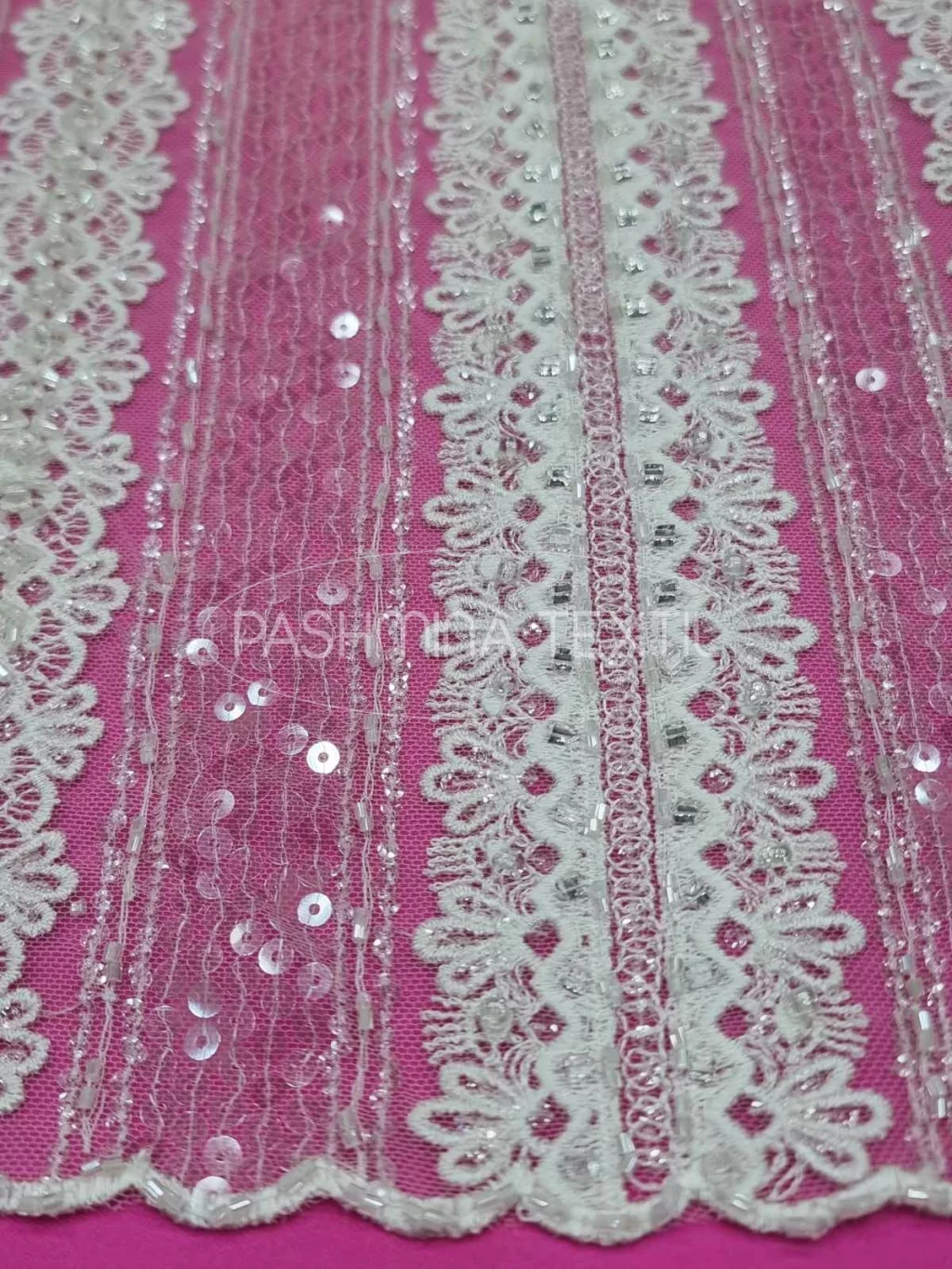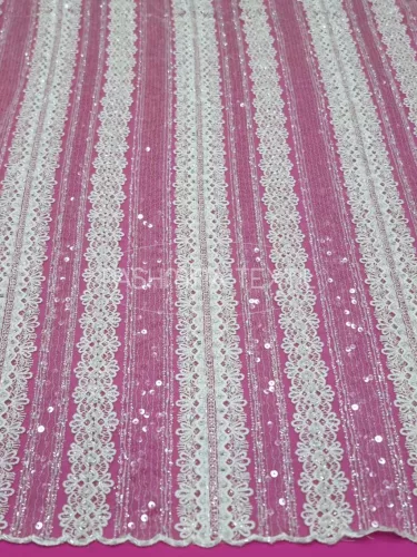 A következő geometrikus csipke, tüll alapra készült. Keresztben hímzett csík és csipke motívumokkal megálmodott gyöngyözött és áttetsző flitterekkel díszített. Szélein két apró és gyöngyözött bordűrrésszel záródik . Tetszés szerint szabással tovább alakítható, forgatható. Izgalmas, modern felsőrészek, teljes csipkeruhák alapanyaga. Szélessége 130 cm.