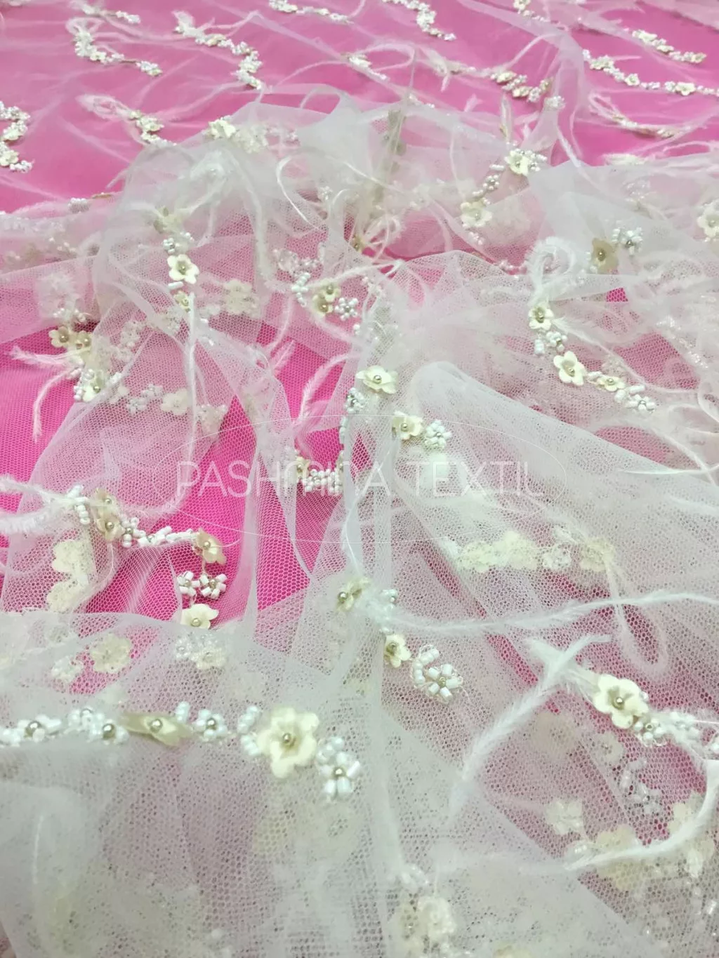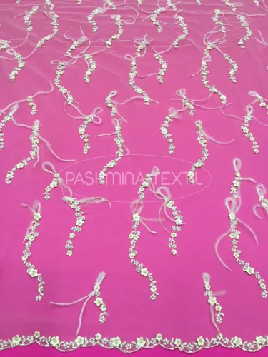 Francia különlegességek egyedi, extravagáns megjelenésű menyasszonyi ruhák elkészítéséhez. Térben gazdagított látványvilága ideális a klasszikus csipkeruhák egyedivé tételéhez. A hímzett tüllalap gyöngyökkel, fémszálakkal, flitterekkel, tollakkal és izgalmas lebegő motívumokkal, levelekkel, selyemvirágokkal díszített. Alkalmas felsőrészek, míderek látványos gazdagításához, avagy az egész ruhát borító elegáns és exkluzív sziluettek megvalósításához. Egyedi megjelenést kölcsönös az arra vágyóaknak.