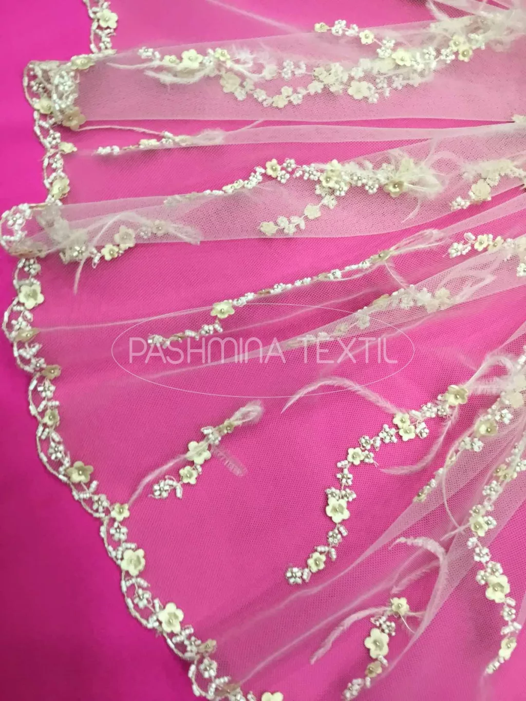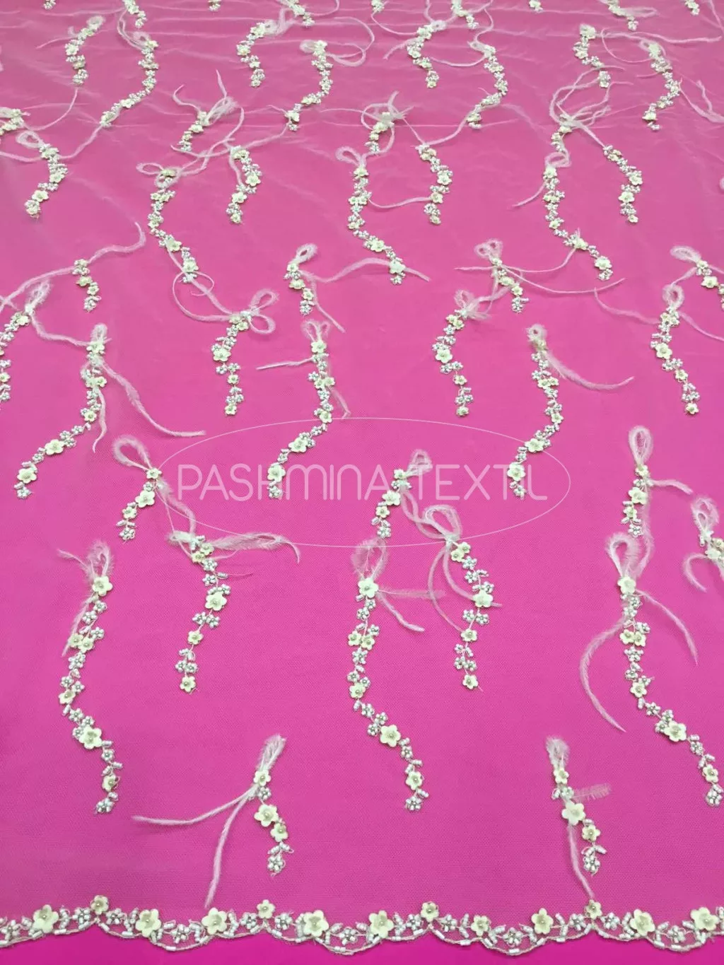Tüll alapra készült, aprón hímzett, gyöngyözött motívumokkal, melyek marabu tollakkal lettek kiegészítve. Applikálható, tetszés szerint akakítható. Két aprón díszített klasszikus bordűrrésszel rendelkezik. 130cm széles.