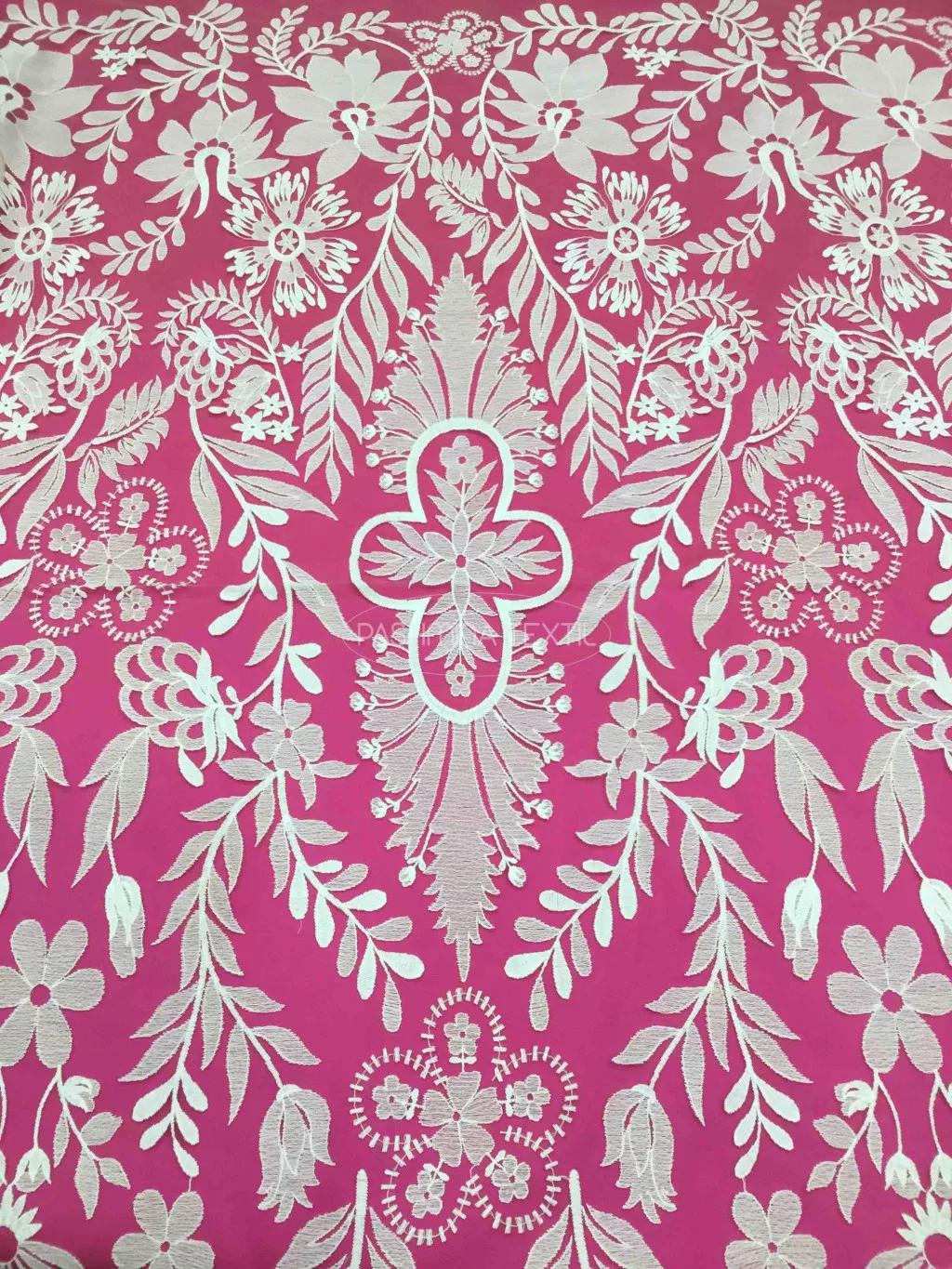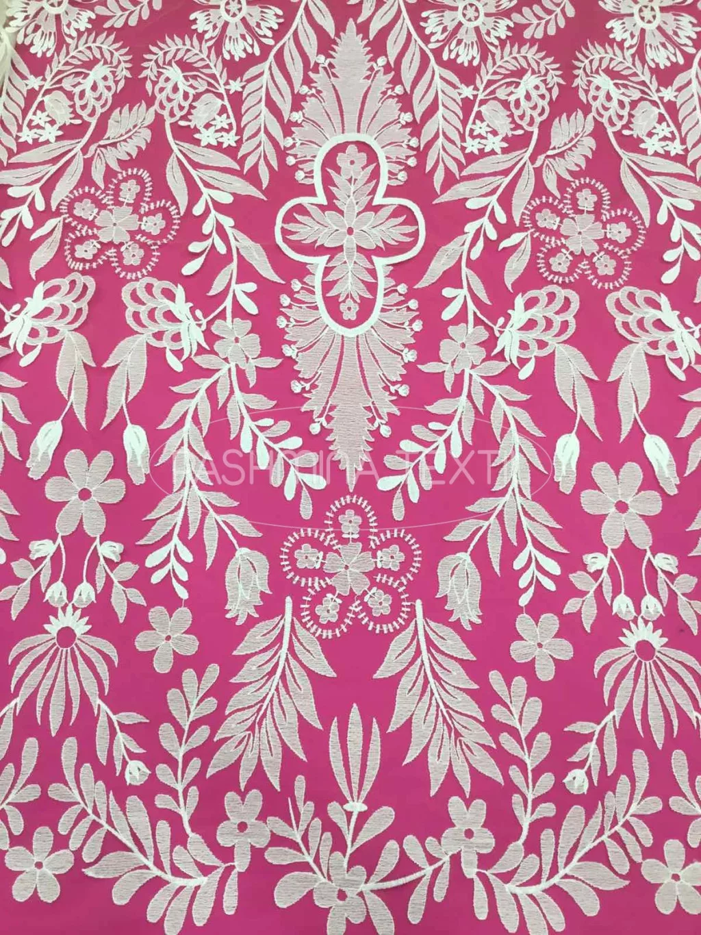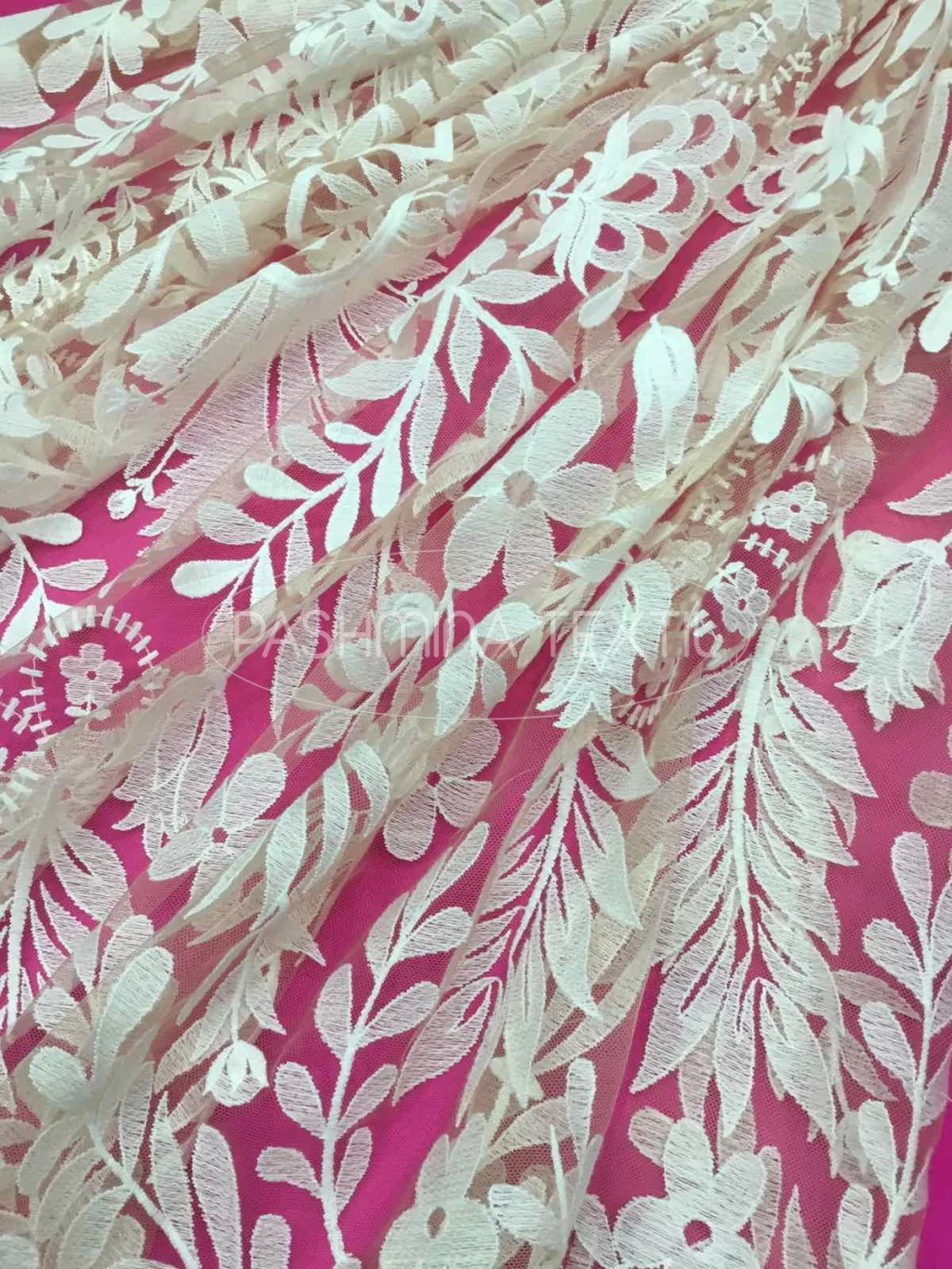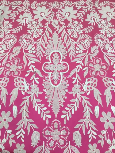 A képen látható csipke egy testszínű alapra készült, indás motivumú csoda. Hímzett motívumai ivory matt pamutfonalakkal készültek. Keresztben mintázott. A csipke szélessége 140 centiméter, ebben teljesednek ki óriási mintái.