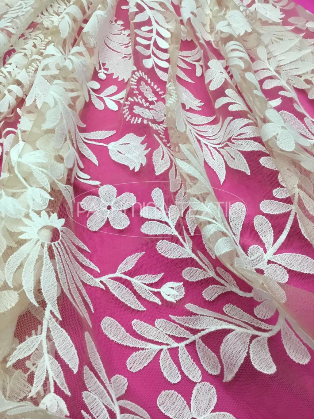 A menyasszonyi ruhák modern, sokrétű alapanyaga tüll alapra készítve. Organikus, nem minden esetben szimmetrikus felhasználásra lehetőséget adó minták sokasága. Esküvői, alkalmi ruhák ékszere.