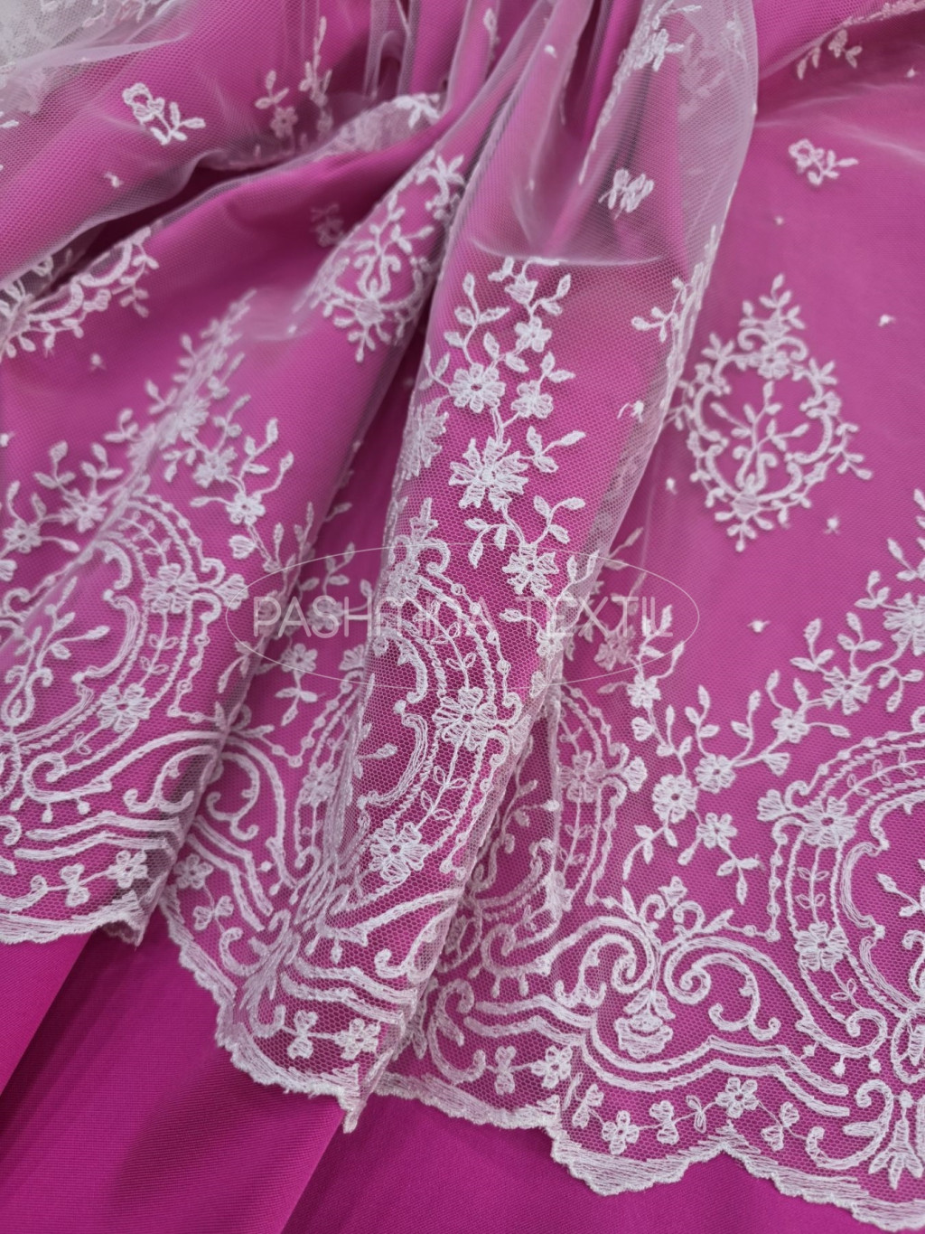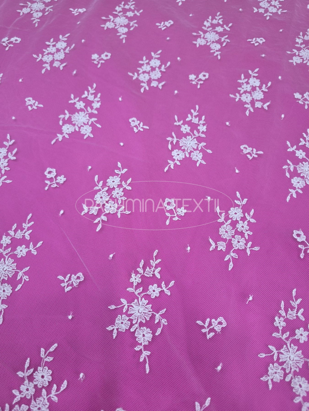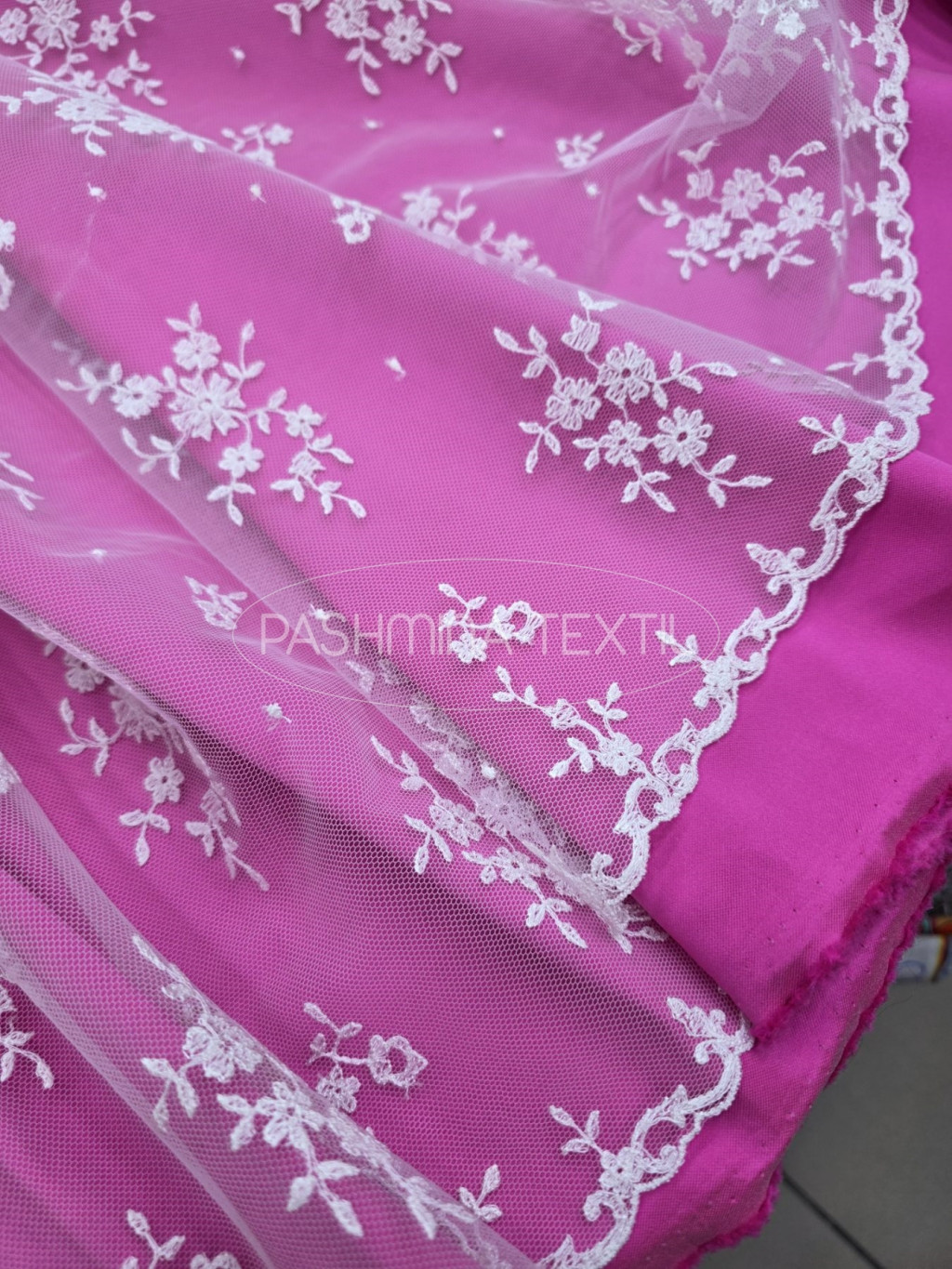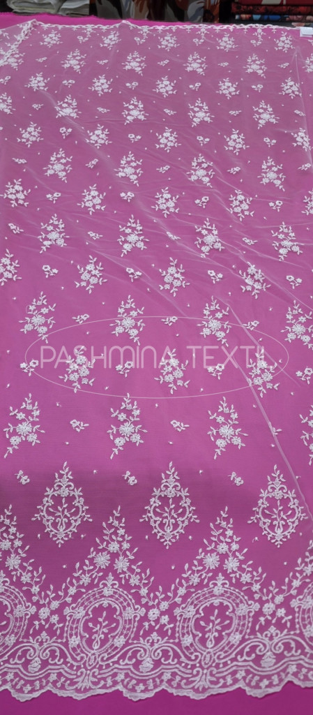 Tüll alapra készült, hímzett motívumokkal.