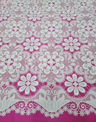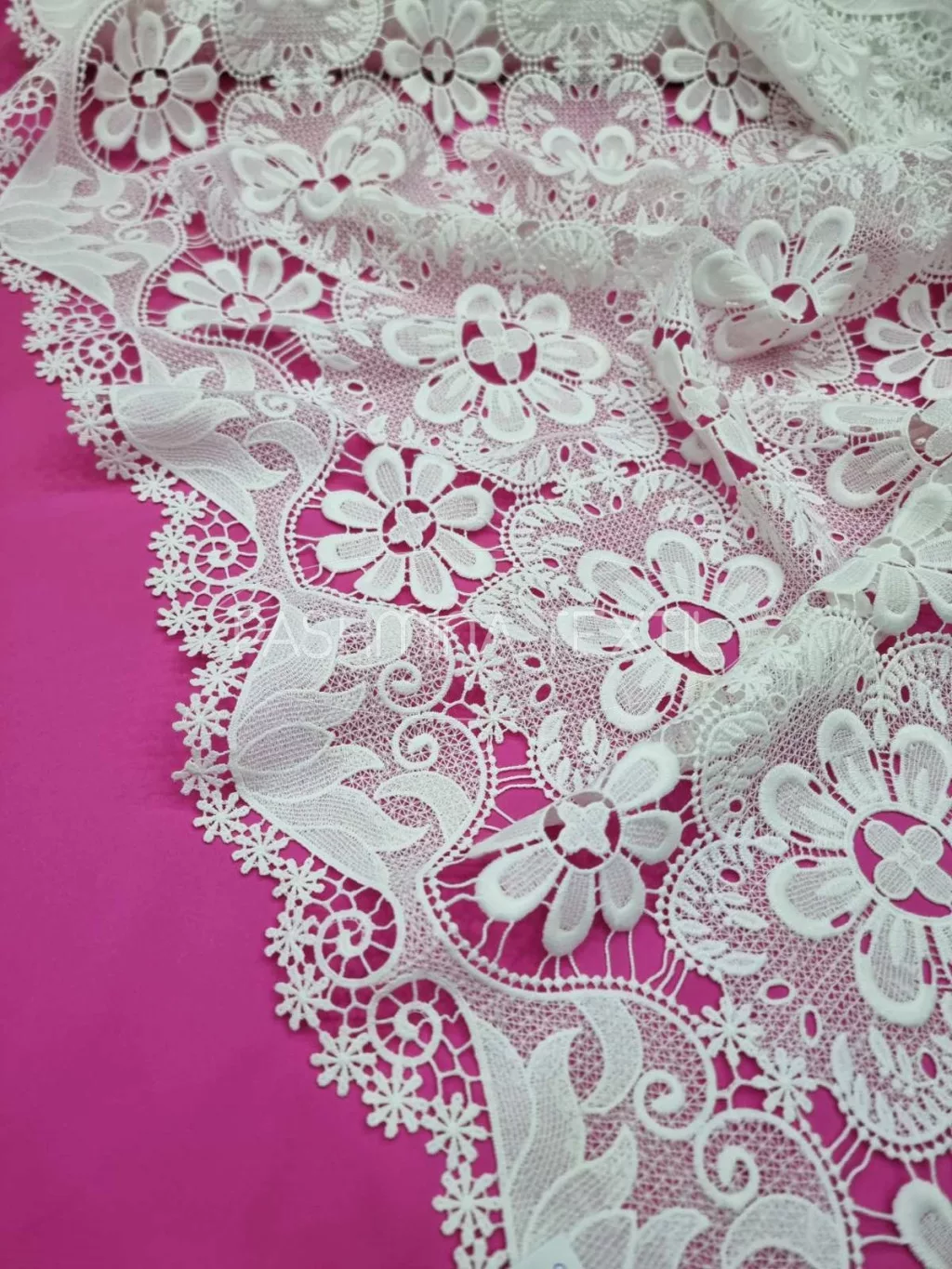 A képen látható csipke két látványos bordűrrésszel rendelkezik. Alap nélküli azaz légcsipke, mintázata matt, egymásba kapcsolódó óriási virág motívumokkal készült. Applikálható, tetszés szerint alakítható. Szélessége 130 cm, összetétele viszkóz.