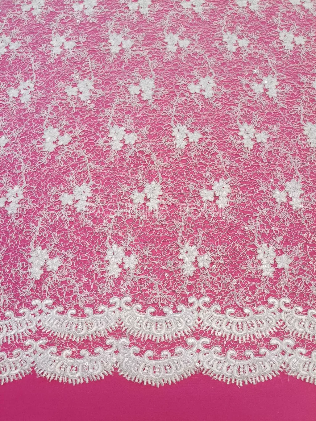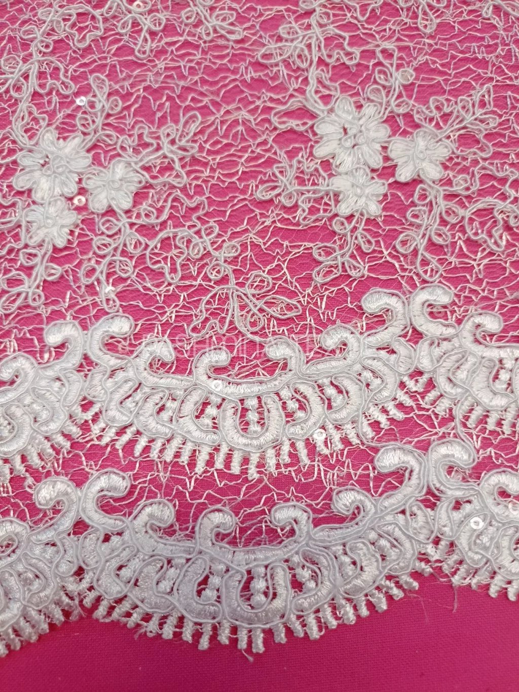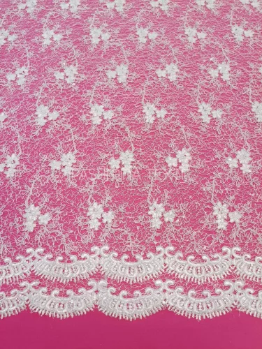 A képen látható csipke két klasszikus bordűrrésszel rendelkezik. Nem klasszikus tüll alapra készült, hímzett és zsinórozott pamut motívumokkal. Díszítése apró flitterekkel lett megoldva. Applikálható, tetszésnek megfelelően alakítható. Szélessége 130cm. Színe fehér-offwhite.