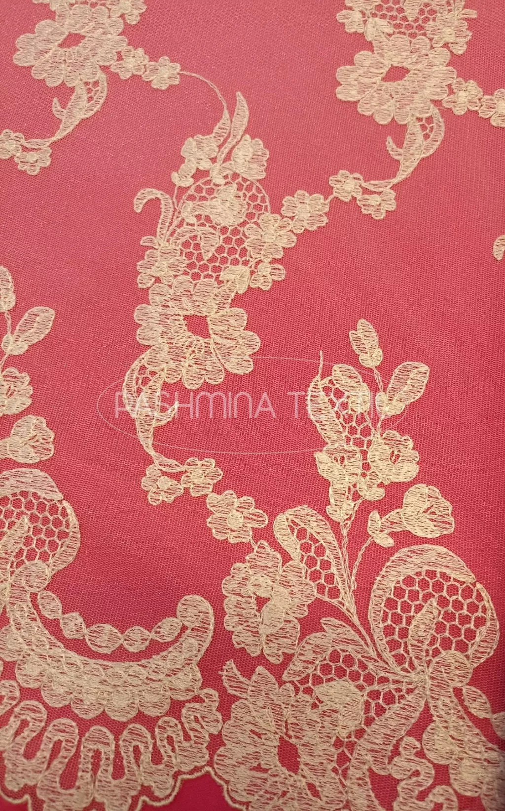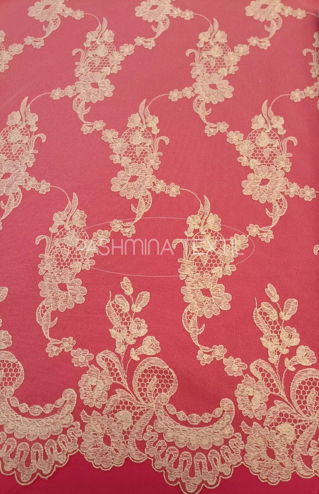 A képen látható csipke egy klasszikus bordűrrésszel rendelkezik. Ekrü színű tüll alapra készült, hímzett viszkóz motívumokkal, melyek elfogyatkoznak. Applikálható, tetszés szerint alakítható. Szélessége 140cm.