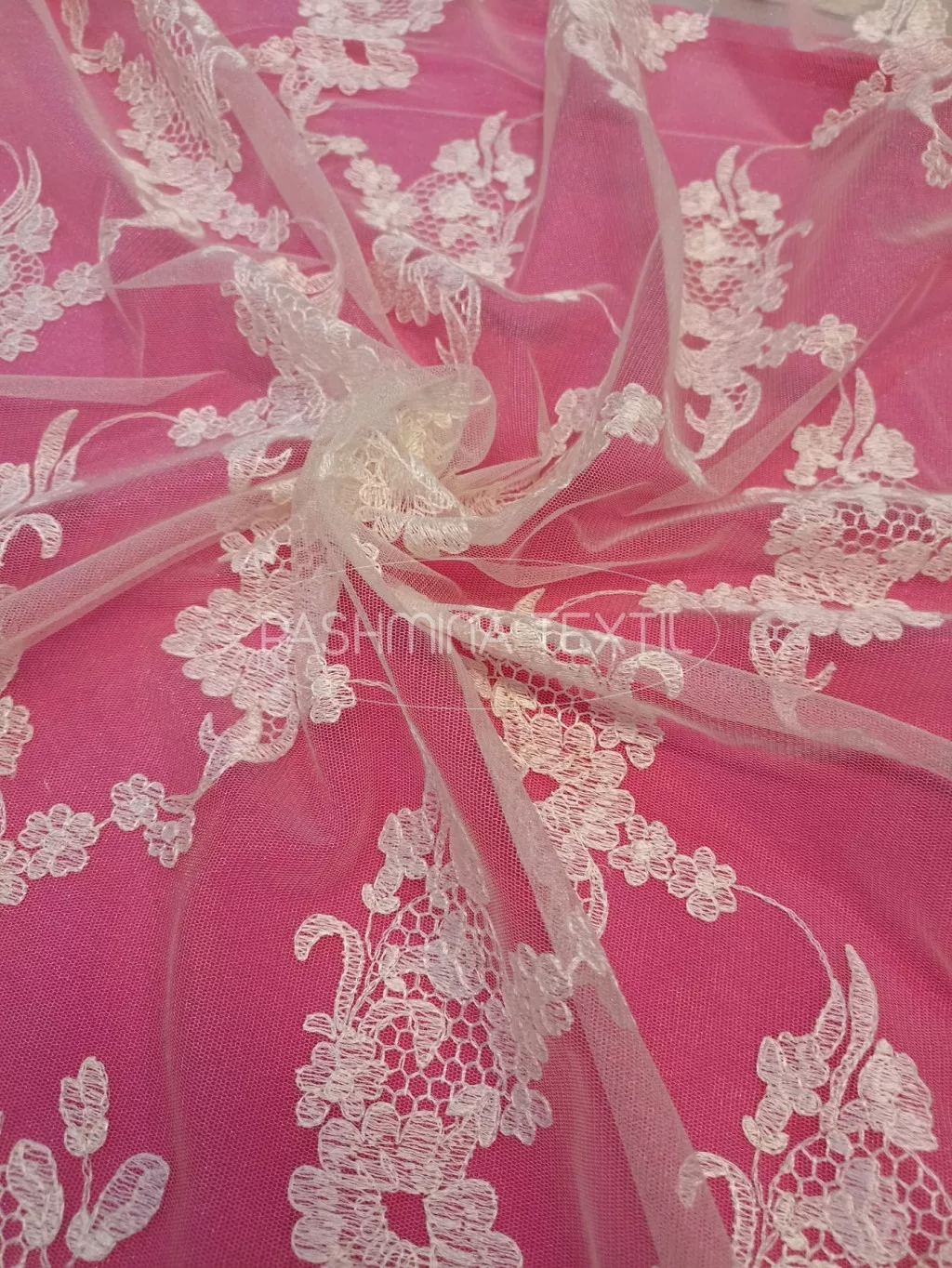 A menyasszonyi ruhák modern, sokrétű alapanyaga tüll alapra készítve. Organikus, nem minden esetben szimmetrikus felhasználásra lehetőséget adó minták sokasága. Esküvői, alkalmi ruhák ékszere.