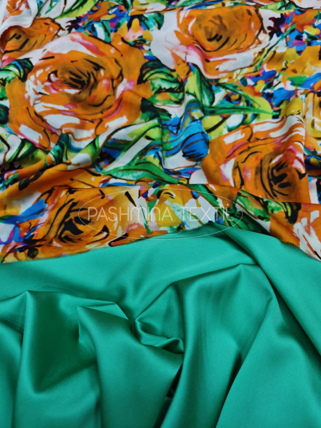 Hernyóselyem szatén - narancs - emerald zöld virágokkal