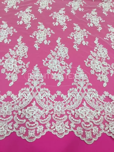 A képen látható csipke két klasszikus bordűrrésszel rendelkezik. Klasszikus tüll alapra készült, hímzett és zsinórozott pamut motívumokkal. Applikálható, tetszésnek megfelelően alakítható. Szélessége 130cm. Színe fehér.