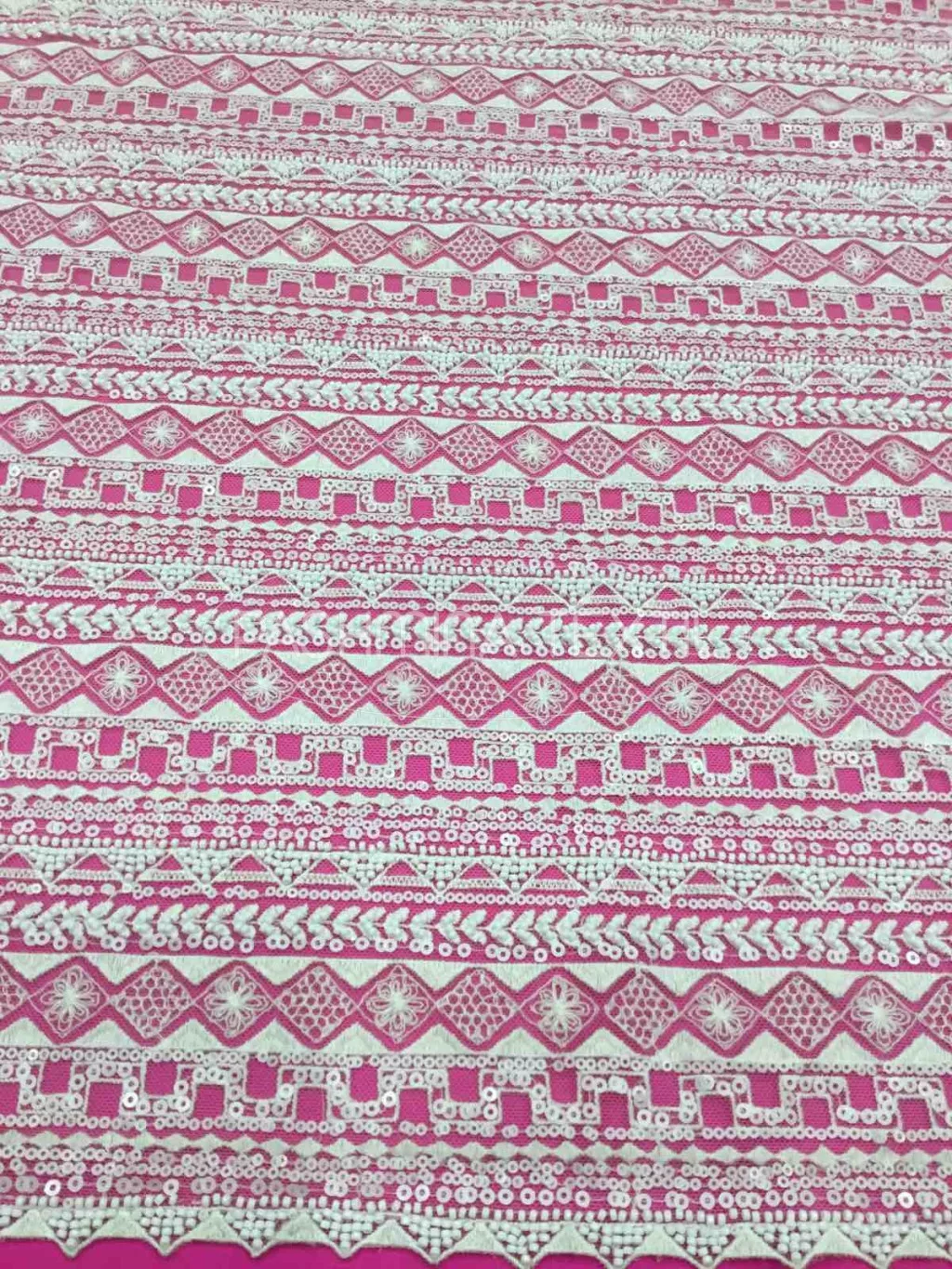 A következő geometrikus csipke, tüll alapra készült. Hosszában hímzett csík és hímzett geometrikus motívumokkal megálmodott gyöngyözött és áttetsző matt flitterekkel díszített. Szélein két apró és gyöngyözött bordűrrésszel záródik . Tetszés szerint szabással tovább alakítható, forgatható. Izgalmas, modern felsőrészek, teljes csipkeruhák alapanyaga. Szélessége 130 cm.