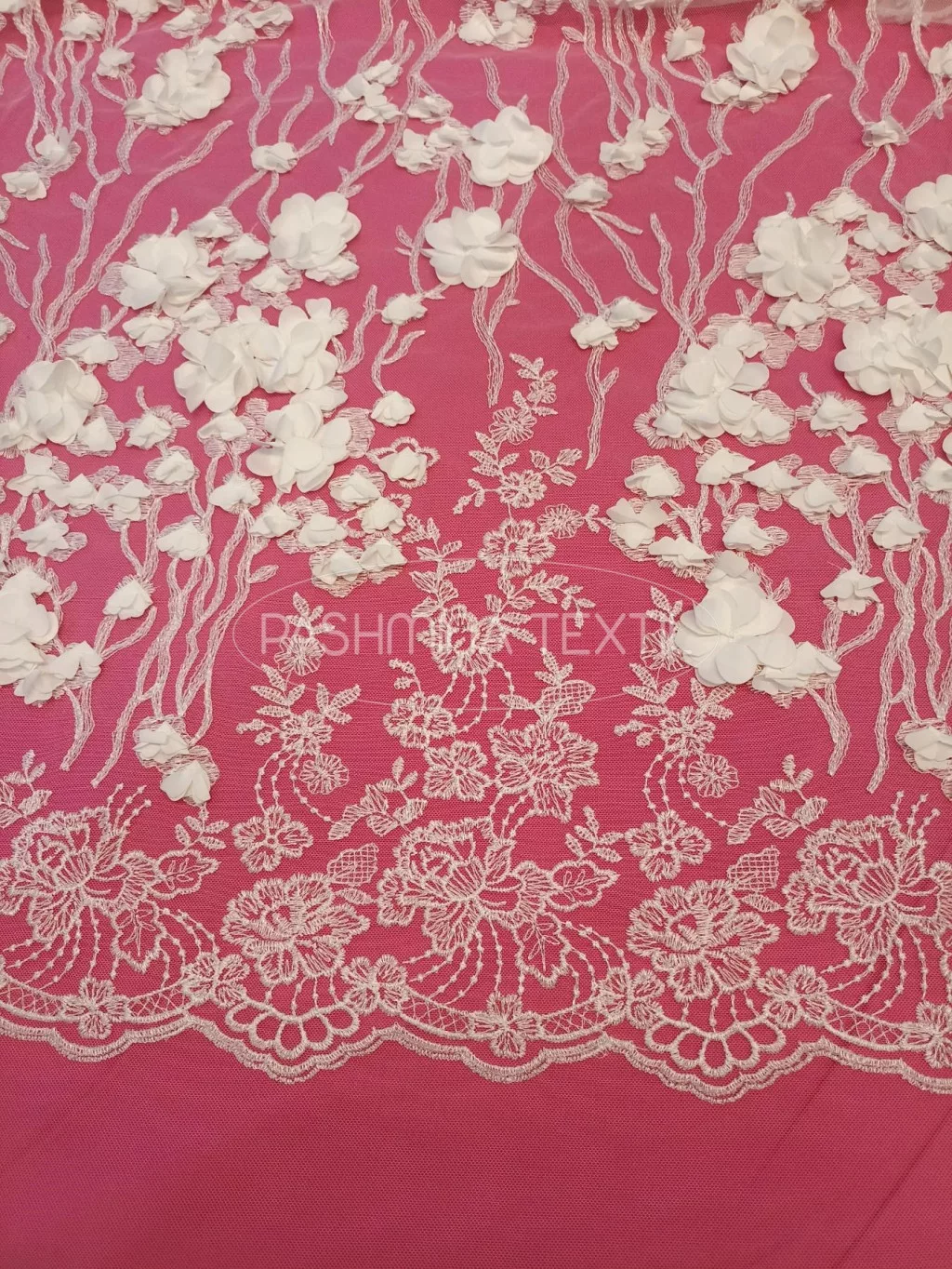 Hímzett bordűrös indás 3D virágos tüllcsipke - Ivory