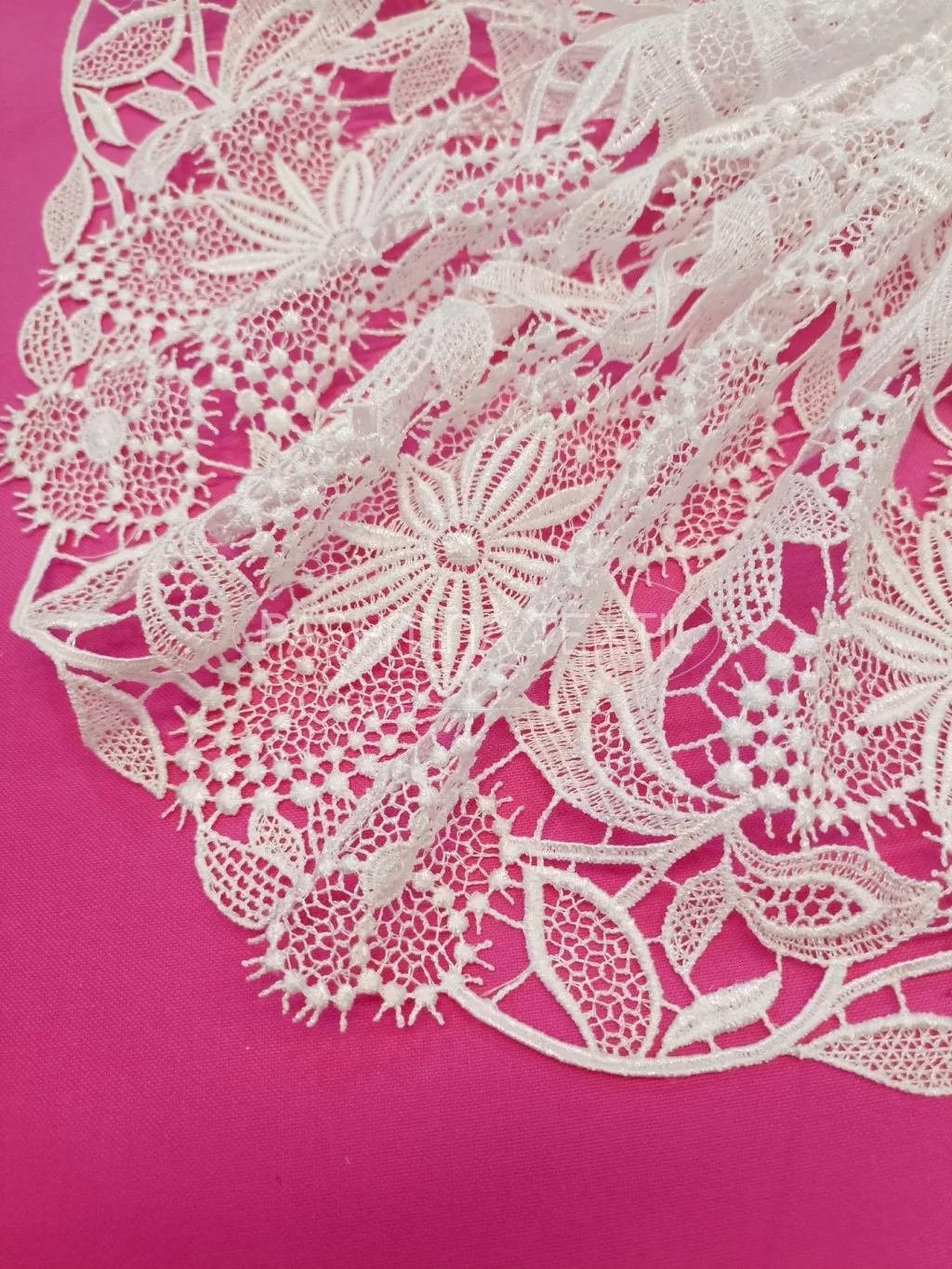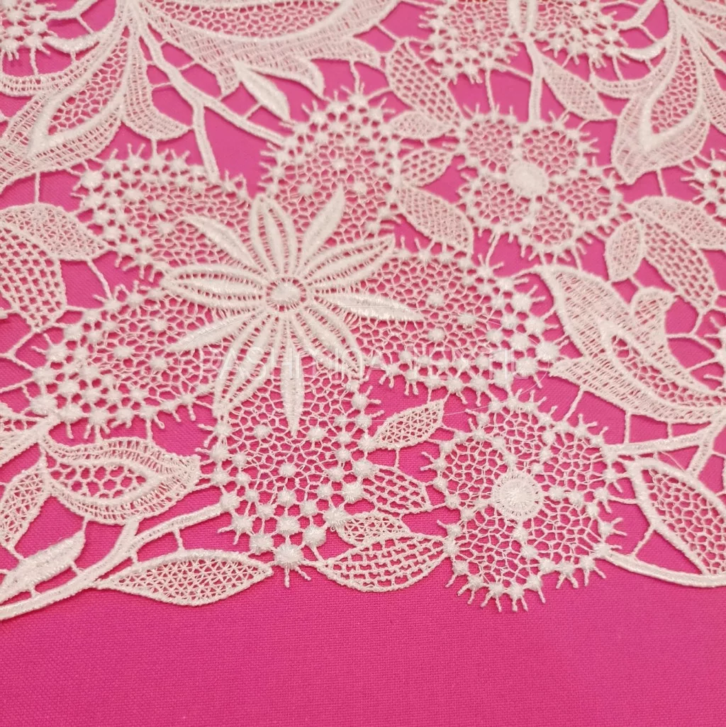 A képen látható csipke kétklasszikus bordűrrésszel rendelkezik. Alap nélküli, egymásba kapcsolódó enyhén fénylő pamut motívumokkal. Applikálható, tetszés szerint alakítható. Szélessége 110 cm. Színe törtfehér.