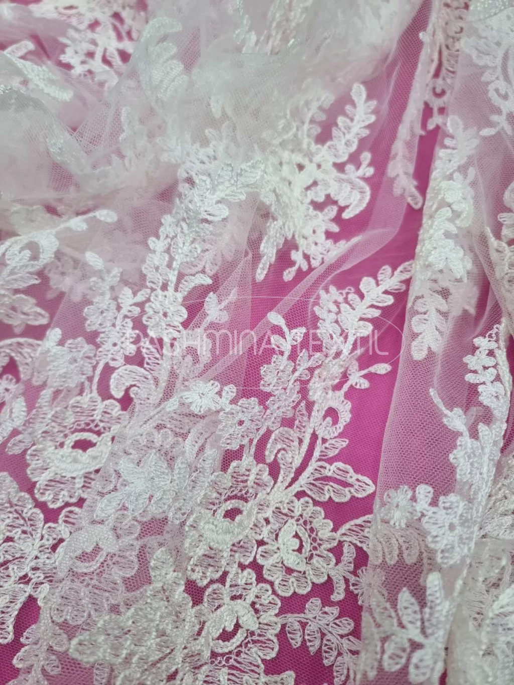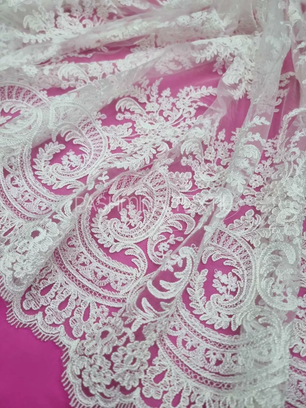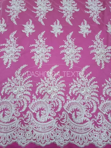 Ez a csipke egy gyönyörű francia kuriózum. Tüll alapra készült, finoman kidolgozott, részletgazdag indás- leveles bordűrrésszel és zsinórozott csokros motívumú. Ajánlott a legklasszikusabb fazonoktól a legextrább elképzelések alapanyagának. Mintázata applikálható, tetszés szerint alakítható.