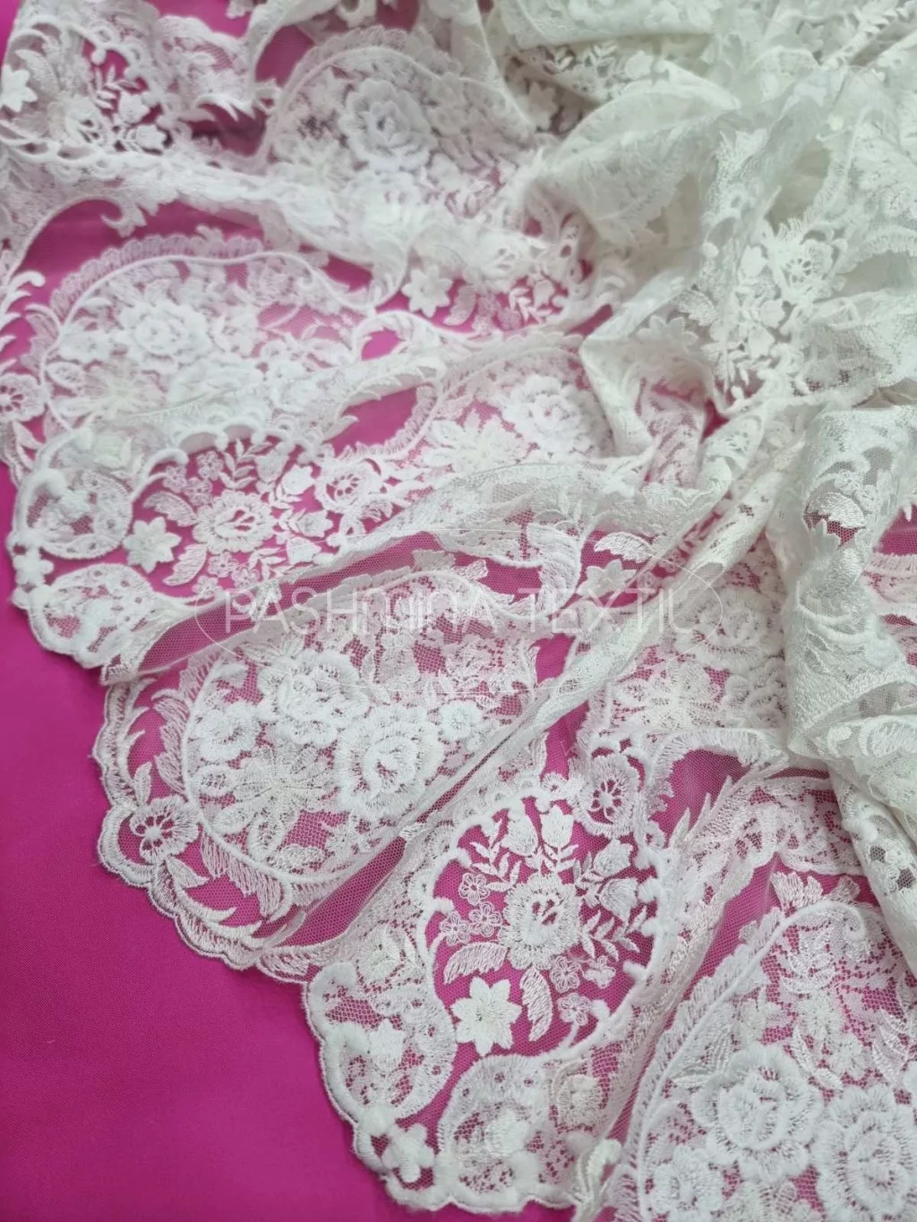 A képen látható csipke két klasszikus bordűrrésszel rendelkezik. Tüll alapra készült, hímzett pamut motívumokkal. Applikálható, tetszés szerint alakítható. Szélessége 130 cm. Színe törtfehér.