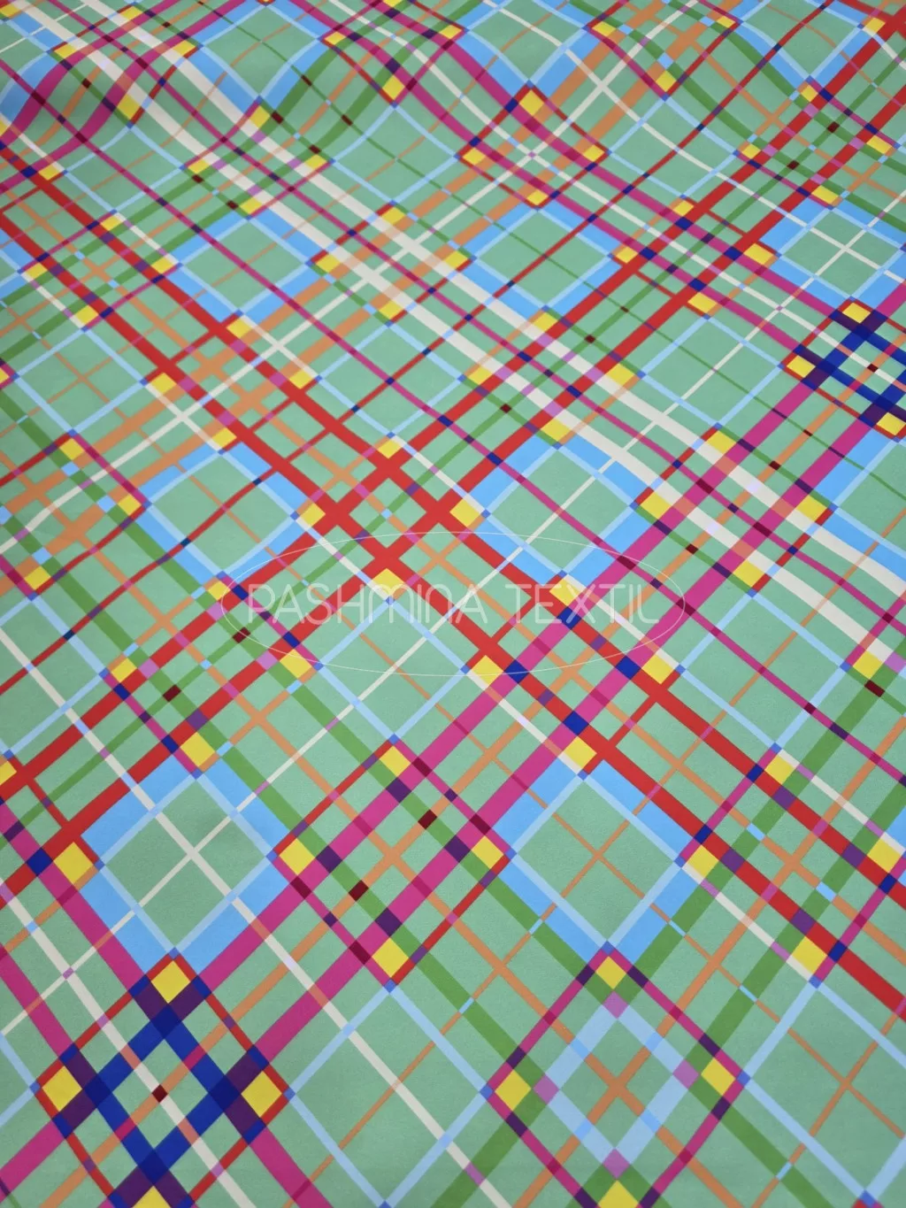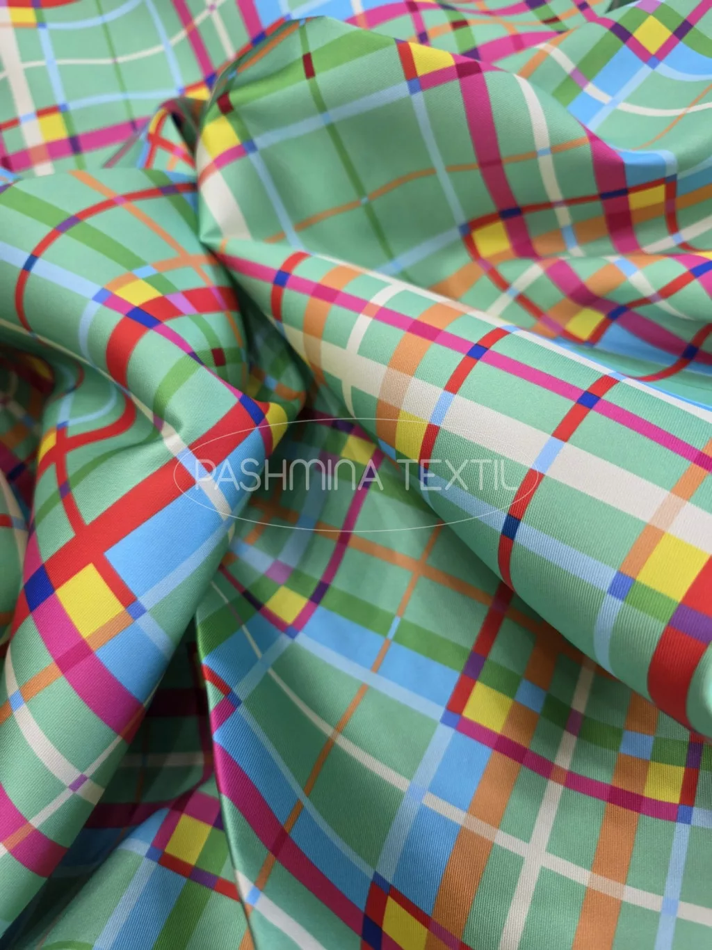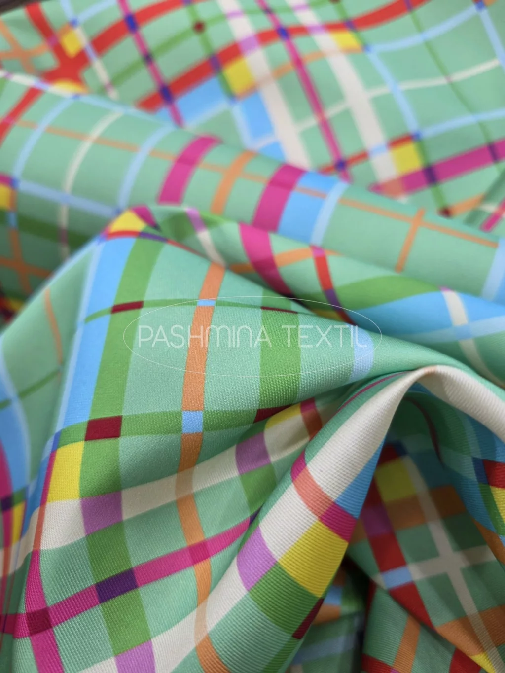Színes rombusz mintás selyem zibbelin a méteráruk egyik legsokoldalúbb alapanyaga. Nemes fénye és tartása miatt tökéletes választás menyecskeruhákhoz, örömanya kosztümökhöz, egyenes vonalú vagy nagy volumenű kis- és nagyestélyikhez, illetve sellő fazonokhoz. Felülete finoman fényes, a szövésirányból adódó sávolyminta közelről látható. Különleges szövése kényelmes, szűkebb és plasztikus fazonok készítésére is alkalmassá teszi. 140 cm széles, 100% PL.