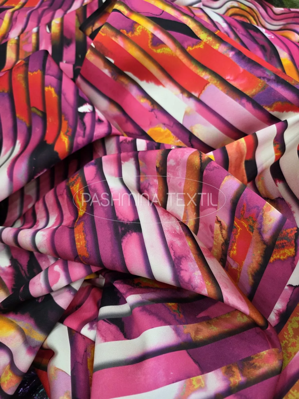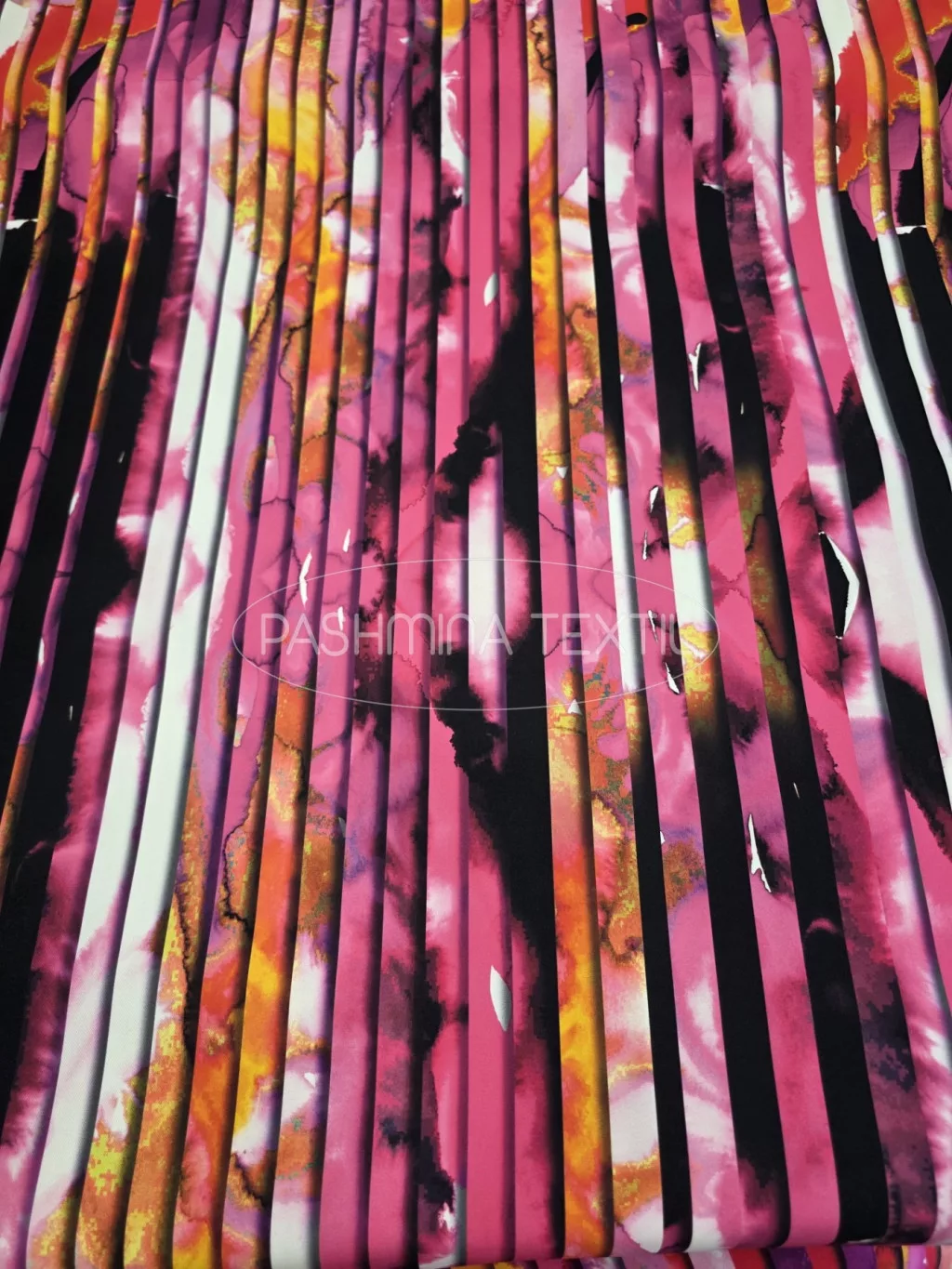 Pink plisszé - modern mintás selyem zibbelin a méteráruk egyik legsokoldalúbb alapanyaga. Nemes fénye és tartása miatt tökéletes választás menyecskeruhákhoz, örömanya kosztümökhöz, egyenes vonalú vagy nagy volumenű kis- és nagyestélyikhez, illetve sellő fazonokhoz. Felülete finoman fényes, a szövésirányból adódó sávolyminta közelről látható. Különleges szövése kényelmes, szűkebb és plasztikus fazonok készítésére is alkalmassá teszi. 140 cm széles, 100% PL.