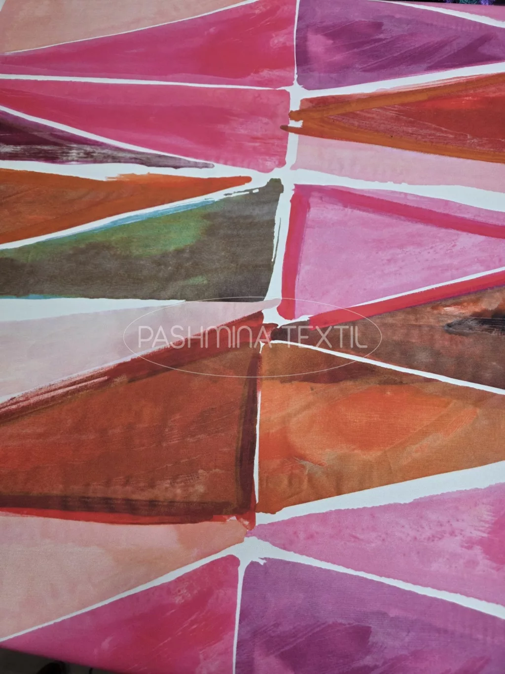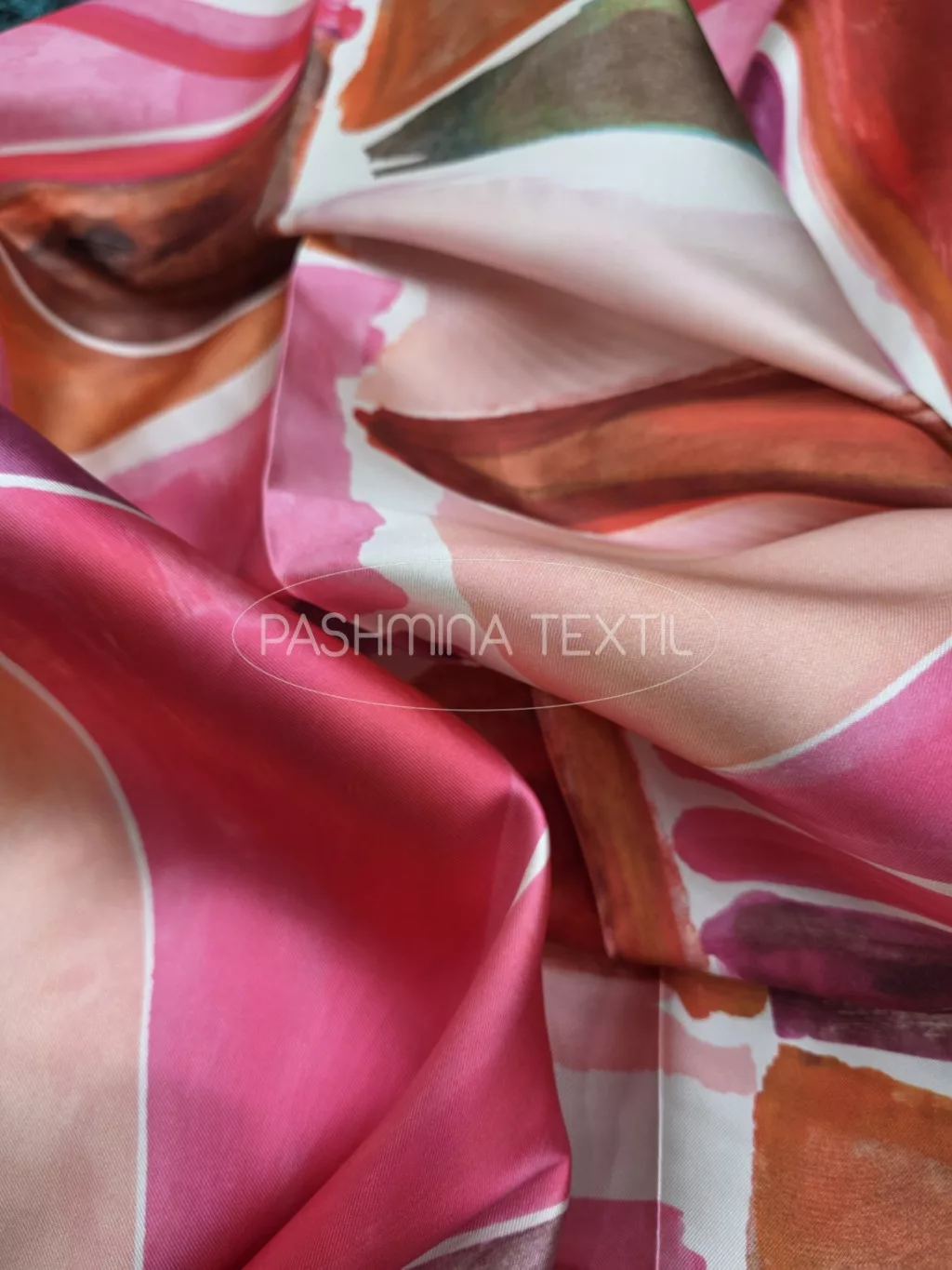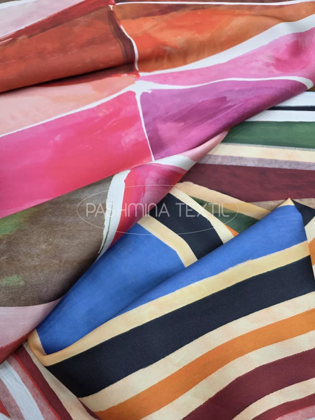 Színes modern mintás selyem zibbelin a méteráruk egyik legsokoldalúbb alapanyaga. Nemes fénye és tartása miatt tökéletes választás menyecskeruhákhoz, örömanya kosztümökhöz, egyenes vonalú vagy nagy volumenű kis- és nagyestélyikhez, illetve sellő fazonokhoz. Felülete finoman fényes, a szövésirányból adódó sávolyminta közelről látható. Különleges szövése kényelmes, szűkebb és plasztikus fazonok készítésére is alkalmassá teszi. 140 cm széles, 100% PL.