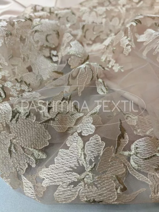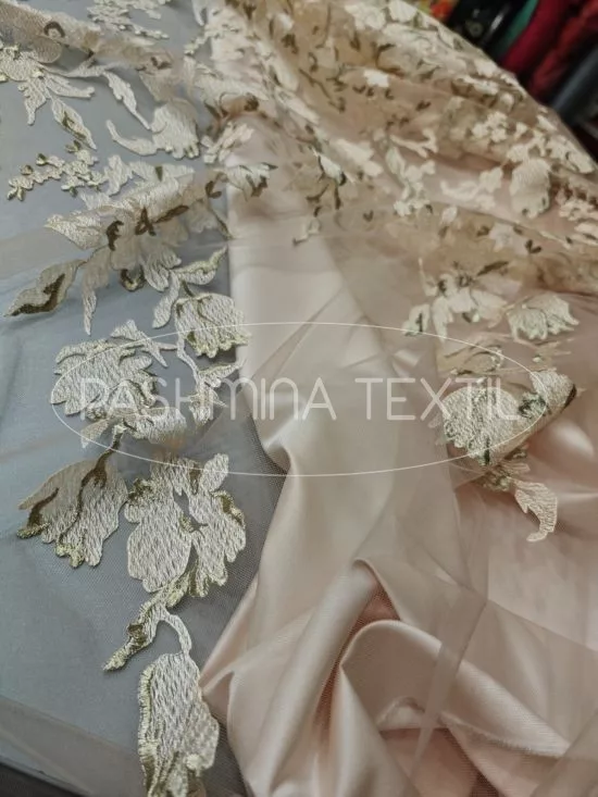 Púder színű Örömanya, alkalmi méteráru válogatás, jó tartású King düseszből és hímzett tüllcsipkéből megálmodva. Ez a két anyag a kifinomultan szabott, plasztikus Örömanya viselethez lett összeválogatva. A két anyag kombinálásával többféle fazonú kosztüm, komplé vagy kabát készíthető.