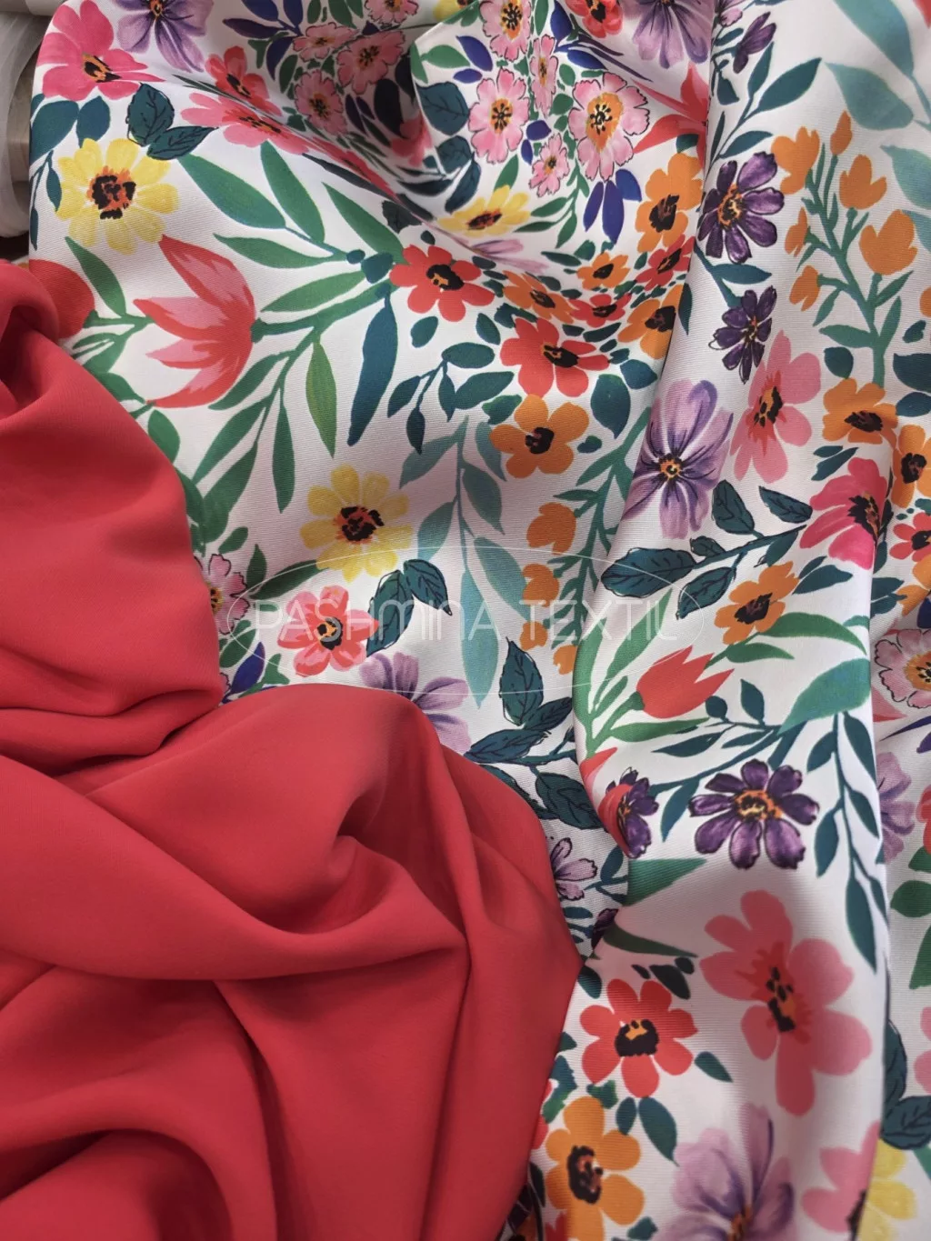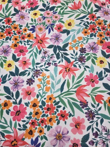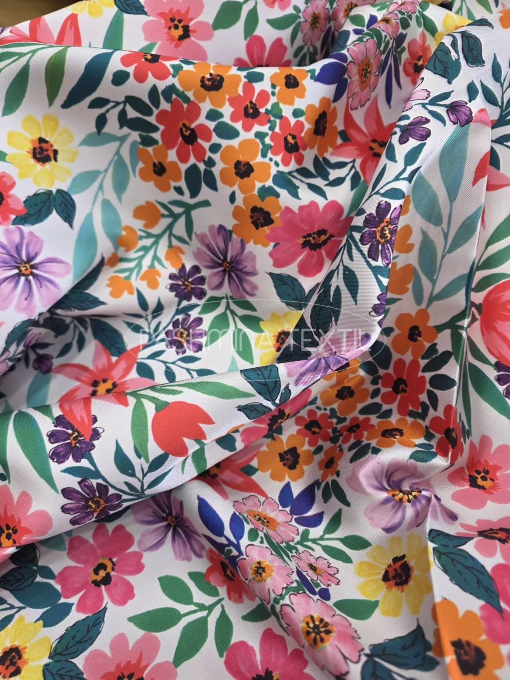 Színes virág mintás selyem zibbelin a méteráruk egyik legsokoldalúbb alapanyaga. Nemes fénye és tartása miatt tökéletes választás menyecskeruhákhoz, örömanya kosztümökhöz, egyenes vonalú vagy nagy volumenű kis- és nagyestélyikhez, illetve sellő fazonokhoz. Felülete finoman fényes, a szövésirányból adódó sávolyminta közelről látható. Különleges szövése kényelmes, szűkebb és plasztikus fazonok készítésére is alkalmassá teszi. 140 cm széles, 100% PL.