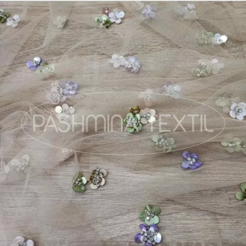 Francia különlegesség egyedi, extravagáns megjelenésűalkalmi ruhák elkészítéséhez. Térben gazdagított látványvilága ideális a klasszikus csipkeruhák egyedivé tételéhez. A hímzett tüllalap izgalmas lebegő flitterből készült motívumokkal, kövekkel díszített. Alkalmas felsőrészek, örömanya kabátok, míderek látványos gazdagításához, avagy az egész ruhát borító elegáns és exkluzív sziluettek megvalósításához. Egyedi megjelenést kölcsönös az arra vágyóaknak.