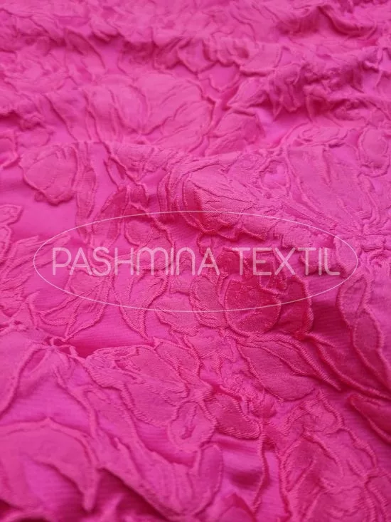 Matt jacquard szövésű nemeskelme, stilizált virág mintázattal, 3D textúrával.