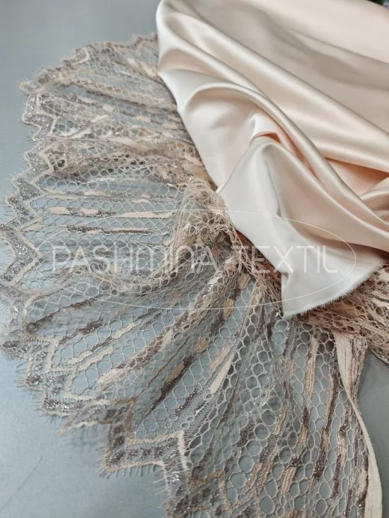 Halvány barack fémszálas geometrikus francia csipke - púder King düsesz hangulat