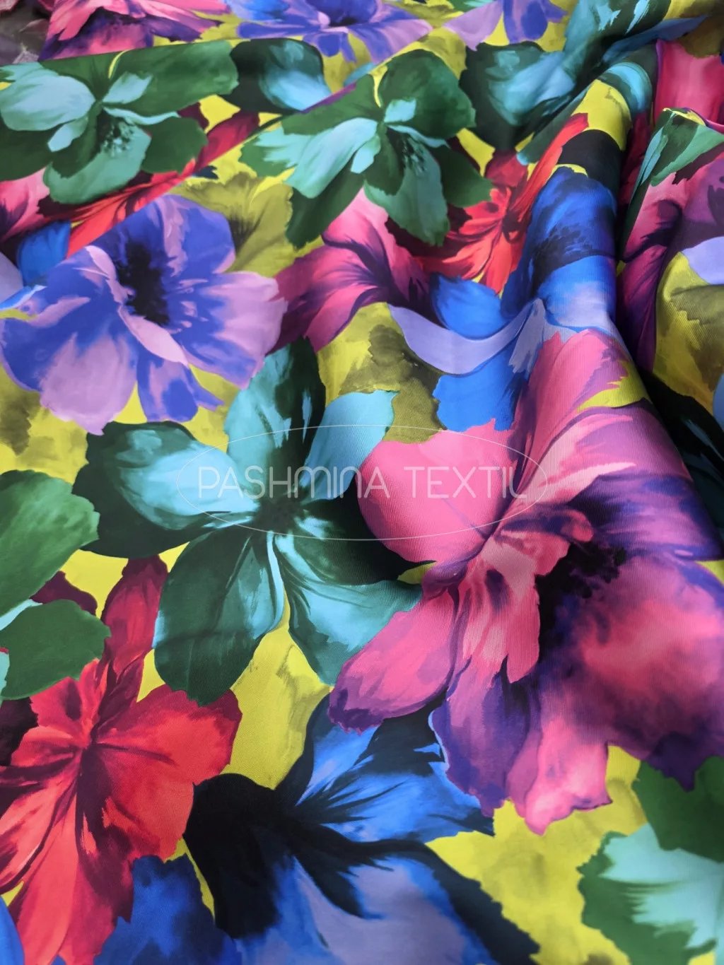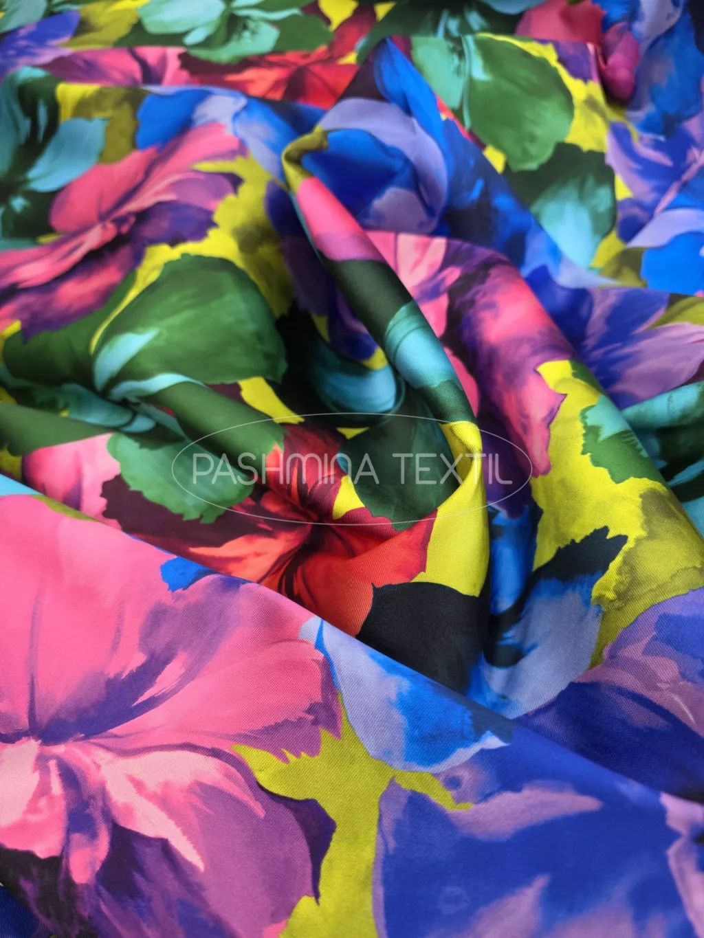 Színes virág mintás selyem zibbelin a méteráruk egyik legsokoldalúbb alapanyaga. Nemes fénye és tartása miatt tökéletes választás menyecskeruhákhoz, örömanya kosztümökhöz, egyenes vonalú vagy nagy volumenű kis- és nagyestélyikhez, illetve sellő fazonokhoz. Felülete finoman fényes, a szövésirányból adódó sávolyminta közelről látható. Különleges szövése kényelmes, szűkebb és plasztikus fazonok készítésére is alkalmassá teszi. 140 cm széles, 100% PL.