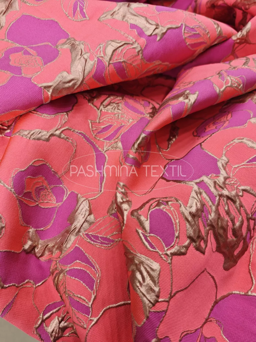 Francia fémszálas selyem jacquard nemeskelme modern, keleti hangulatú absztrakt mintával és 3D textúrával. Ideális alapanyag királynői, nagy volumenű fazonokhoz, kosztümökhöz és komplékhoz. Nemeskelme kínálatunkban a megfelelő színű és tulajdonságú anyagokkal egyedi, személyre szabott látványvilágú öltözék készíthető belőle. Egyben megvásárolható bővülő fazonú öltözék vagy több részes öltözék mennyiség. Szélessége 130 cm.
