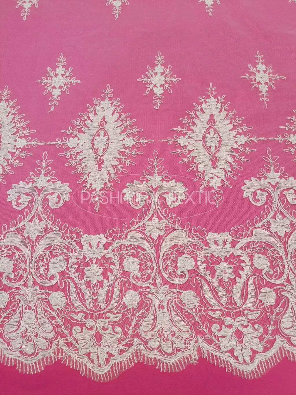 A képen látható csipke két klasszikus bordűrrésszel rendelkezik. Klasszikus tüll alapra készült, hímzett és zsinórozott pamut motívumokkal. Applikálható, tetszésnek megfelelően alakítható. Szélessége 130cm. Színe fehér-offwhite.
