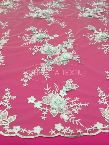 Francia különlegességek egyedi, extravagáns megjelenésű menyasszonyi ruhák elkészítéséhez. Térben gazdagított látványvilága ideális a klasszikus csipkeruhák egyedivé tételéhez. A hímzett tüllalap gyöngyökkel, fémszálakkal, flitterekkel, tollakkal és izgalmas lebegő motívumokkal, levelekkel, selyemvirágokkal díszített. Alkalmas felsőrészek, míderek látványos gazdagításához, avagy az egész ruhát borító elegáns és exkluzív sziluettek megvalósításához. Egyedi megjelenést kölcsönös az arra vágyóaknak.